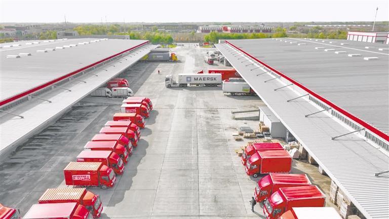 在京東物流銀川亞一分揀中心,一輛輛物流卡車有序進出。