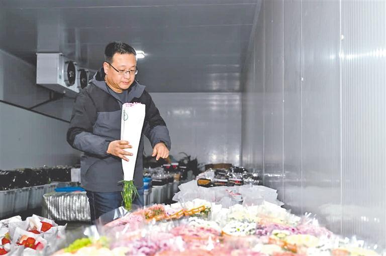 “雙11”期間,寧夏芊藝農業科技有限公司的花卉俏銷全國。圖為工作人員在冷庫內整理花卉。