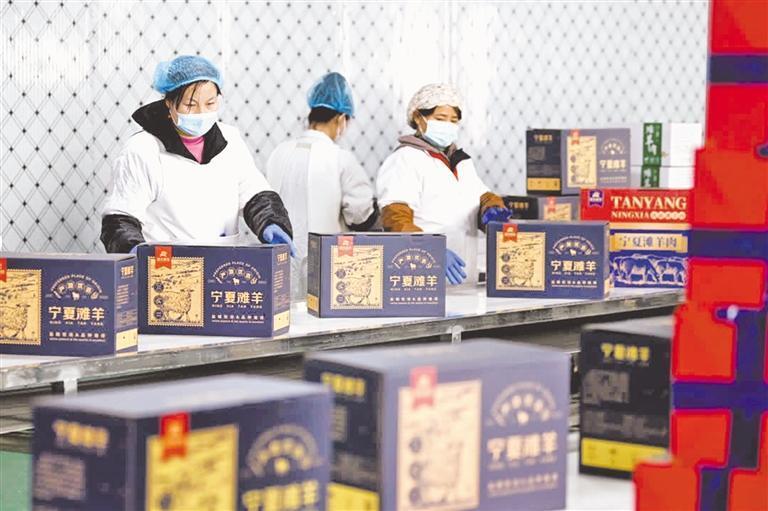 灘羊鮮生車間,員工加緊包裝寧夏灘羊禮盒備貨。