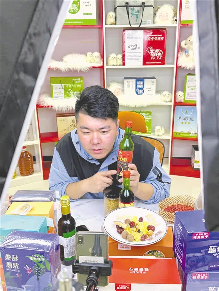 獅城寧好電商網批(西部)運營基地里,主播直播推廣鹽池灘羊、雜糧、枸杞原漿等特色產品。