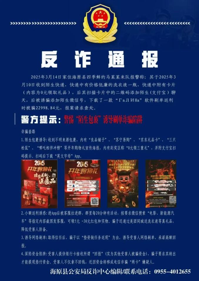 近期,利用快遞渠道郵寄“三只松鼠”“良品鋪?zhàn)印钡葤叽a中獎(jiǎng)傳單的詐騙方式多發(fā)高發(fā),在刑偵總隊(duì)和市局偵查中心的緊急統(tǒng)籌指揮下,海原縣公安局反詐中心積極響應(yīng)、主動(dòng)作為、連續(xù)作戰(zhàn),成功攔截尚未送達(dá)的“詐騙快遞”1000余份,最大限度保護(hù)群眾的財(cái)產(chǎn)安全。